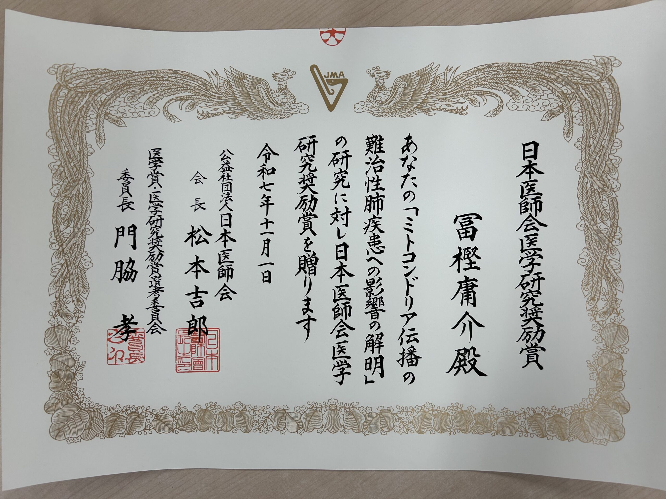 冨樫先生が「日本医師会医学研究奨励賞」を受賞されました。おめでとうございます。